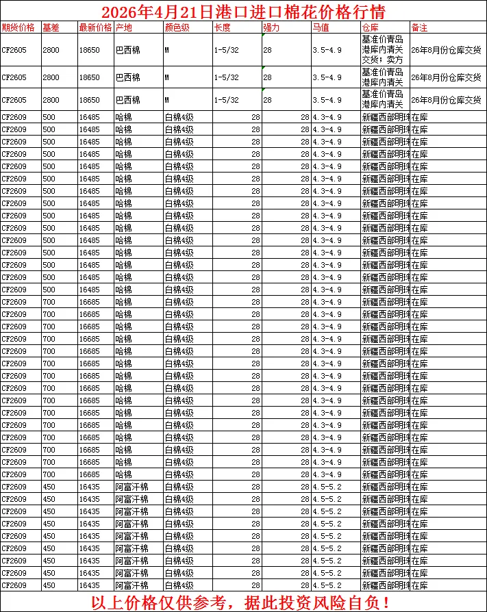据顺风棉花网sfmianhua.com棉花大数据中心最新监测显示,4月21日港口最新进口棉花价格行情。长期追踪棉花市场价格变动,欢迎关注我们。 顺风棉花网始创于2005年8月,是国内最早从事棉花信息咨询服务的专业平台之一。二十年来,我们始终致力于为产业链企业提供涵盖籽棉、皮棉、进口棉及棉花期货的全方位信息咨询服务,已成为业内信赖的专业信息机构。依托深厚的行业数据积淀与持续的研究,我们为棉纺企业提供精准、及时的《美棉每日报告》与《郑棉每日报告》,助力企业进行基差点价、期货套保、场外期权及生产经营决策,有效应对市场波动。【核心会员服务内容】每日棉花现货与期货价格基差数据最新皮棉行情与港口进口棉行情速递专业日报:美棉市场日报、郑棉市场日报深度行情动态与市场预测分析