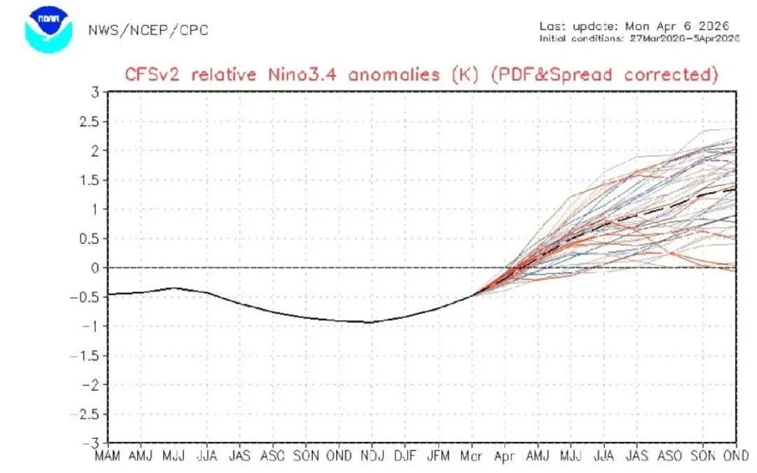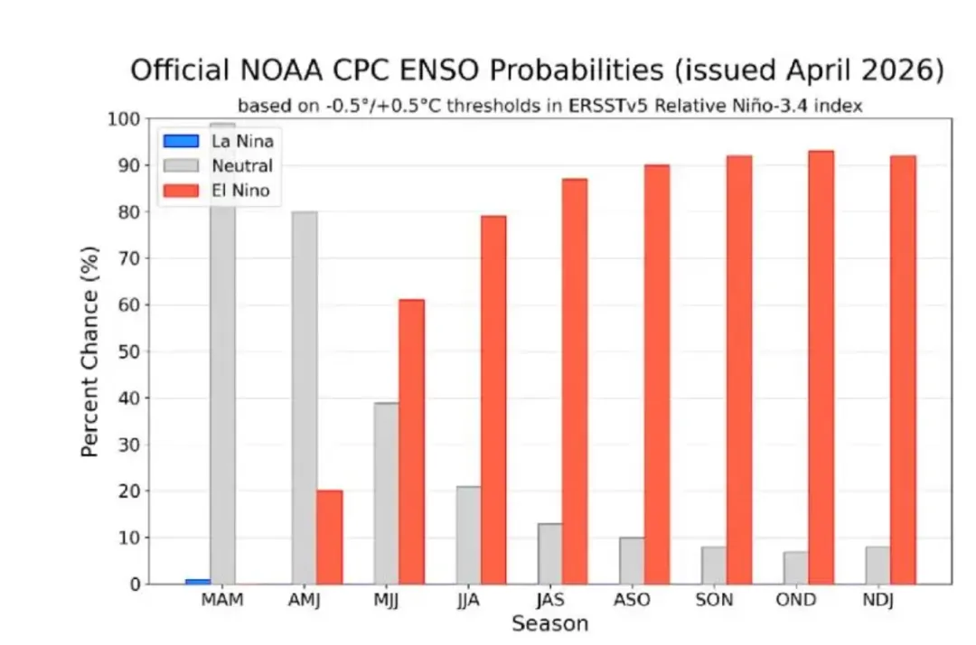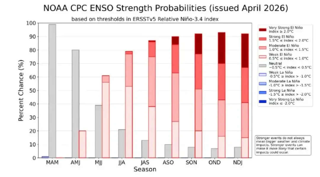 NOAA,美国国家海洋和大气管理局预判今年会有50%概率是强/超强厄尔尼诺。