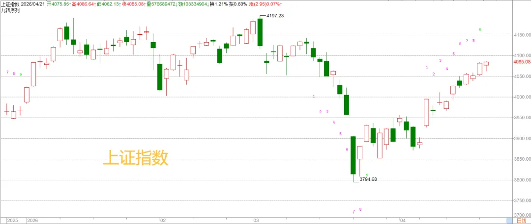 上证指数目前在趋势之上运行,昨天有个九转序列高9,我们从上周3晚上就说本周一大概率会出现九转序列高9,但趋势之上的高9,需要一个相对大一点级别的结构来辅助,昨天没有出现相对较大级别的结构,因此只能判断为一个小小高点,没有可操作性,所以我们暂时不予理会这个序列高9,这在昨天的盘后收评也特别提示。