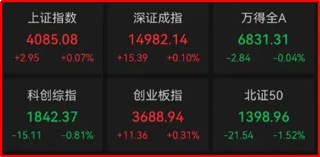 1. 指数表现:沪指微涨0.07%报4085.07,深成指涨0.10%,创业板指涨0.31%