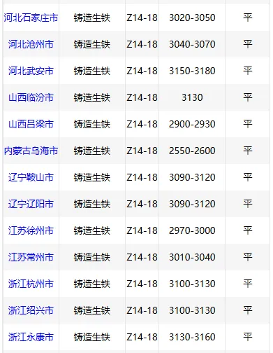 4月21日华东市场炼钢 生铁报价稳,主流报价2700-2920元/吨,现款含税,一单一议。4月21日华中市场铸造 生铁价格稳,Z18林州2980,黄石2940-2970,郴州2800,现款含税。(元/吨)4月21日华北地区铸造 生铁价格稳,Z18武安3150-3180元/吨,临汾3130元/吨。4月21日东北铸造 生铁报价稳,鞍山3090-3120、辽阳3090-3120元/吨,现款含税。4月21日西南铸造 生铁价格稳,Z18报2880-3150元/吨,现款含税。4月21日西北铸造 生铁价格稳,Z18乌海2550-2600新疆2800甘肃2800包头2700,现款含税(元/吨)。4月21日华中地区炼钢 生铁价格稳,安阳2630元/吨,大冶2560元/吨,现款含税。4月21日西北炼钢 生铁报价稳,宁夏2500包头2500甘肃2650,现款含税。(元/吨)4月21日华北地区炼钢 生铁报价主稳个调,唐山2640元/吨。4月21日华南铸造 生铁价格稳,Z18广西3000,高州3040,阳江3040,现金含税。(单位:元/吨)4月21日华南地区炼钢 生铁价格稳,广东地区L8-L10报2600元/吨,现款含税。扫码加入生铁废钢交易群想要了解更多价格行情,就上铸材行情