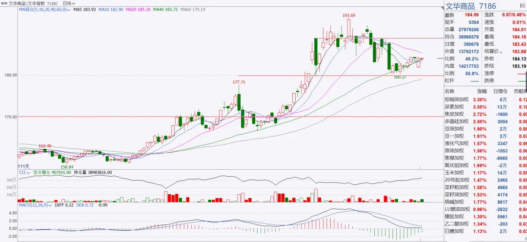 今日文华商品指数和上证指数都是“横着走”,整体氛围偏多。