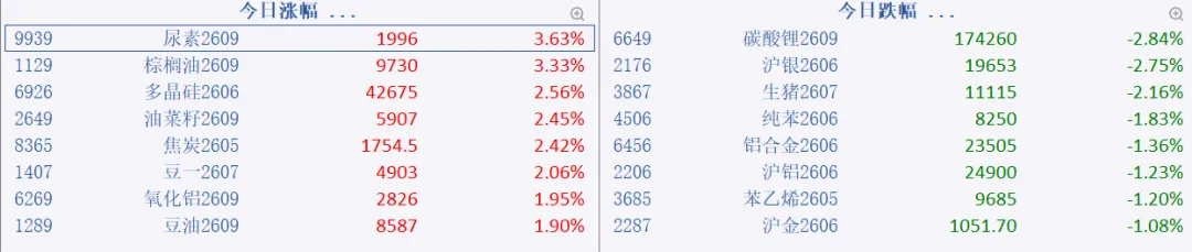 今日收盘,国内期货主力合约涨跌互现。棕榈油、尿素涨超3%,焦炭、豆一、多晶硅涨超2%,烧碱、氧化铝、豆油、豆二涨近2%。跌幅方面,碳酸锂、沪银、生猪跌超2%,铝合金、沪铝、纯苯、铂、沪金、苯乙烯跌超1%。二、操作