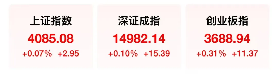 上证指数以4085.08点收盘,涨0.07%。深证成指涨0.10%,创业板指涨0.31%。