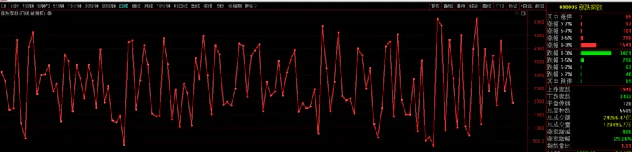 上涨家数1949家,下跌家数为3431家,下跌家数偏多。