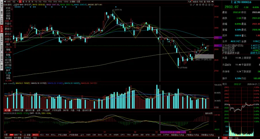 今天缩量下跌0.05%,收了一根十字星,保持平量的话,这里看窄幅振荡。
