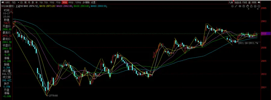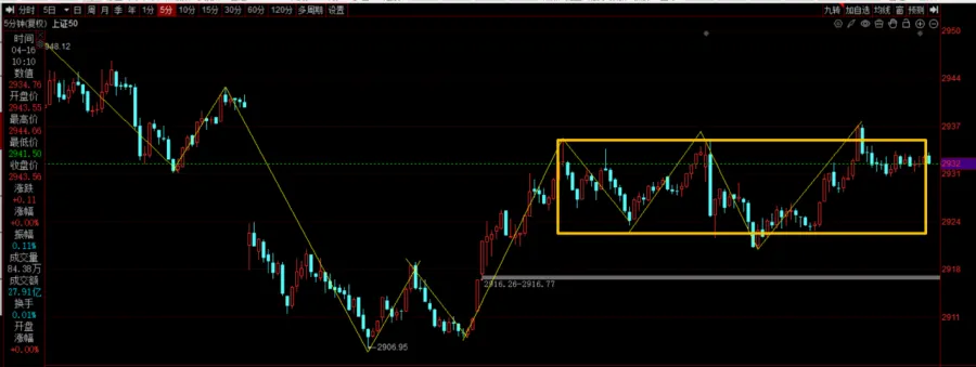 30 分钟级别上表现为在走向上一笔,目前这个位置在构建新的中枢,是第三个中枢。