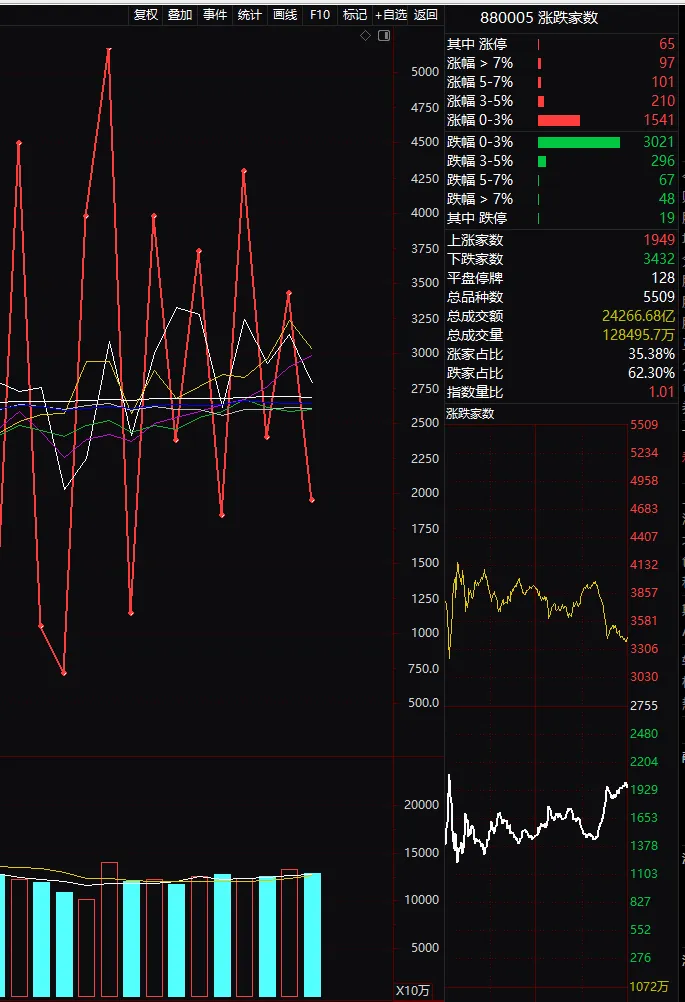 3,收盘成交24266亿,缩量1799亿。成交量还是在强势水平,也因此,虽然涨跌比数据不佳,但赚钱效应还在——机构主导的趋势股行情。