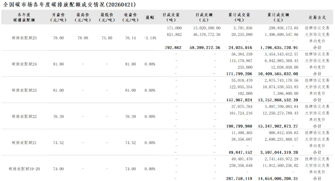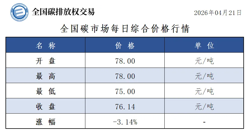 当前位置:首页>行情>全国碳市场每日综合价格行情及成交信息20260421