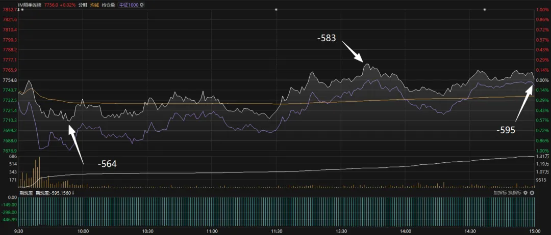 个股涨跌比接近2:3,下跌的偏多一些,赚钱效应一般(如上图)。1000期指(隔季合约)贴水收盘在-595(新的12月合约如下图,来源chocie),指数下跌贴水增加,指数上涨贴水增加。代表主力在做低吸高抛,市场或趋于振荡。