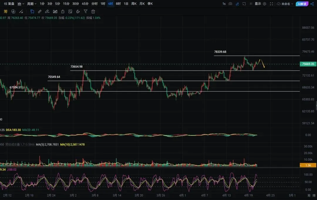 四小时周期盘面自低位止跌之后开启回升修复节奏,空头抛售动能持续衰减耗尽,价格重新收复关键技术支撑位置,短线盘面进入企稳回血阶段,不过整体反弹拉升的势能相对偏弱,价格触及高位压力区域便容易承压回落反复震荡。一小时周期市场成交成交量持续缩量,多空资金博弈陷入均衡拉扯状态,盘面暂无明确单边趋势行情走出。市场强弱分水岭界限分明,价格有效企稳站稳76000关口上方,方能进一步积蓄多头反攻动能拓展上行空间,反之一旦有效跌破75000支撑关口,行情将会再度回落测试74000重要防守点位。日内整体交易操盘思路清晰明朗,整体围绕74000至77000核心震荡大区间开展高抛低吸波段操作,顺应盘面节奏灵活进退,严守风控原则把握波段盈利机会。
