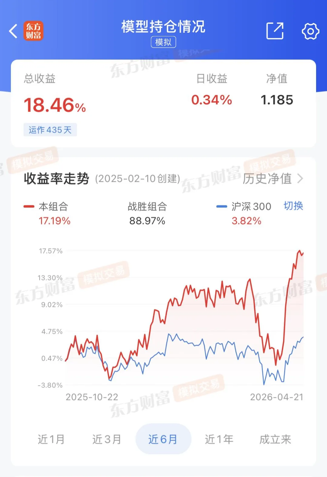 今天全市场1949家上涨,3431家下跌,成交额合计24266亿元,较前一交易日缩量1799亿元,涨跌停比65:19,涨幅居前的板块为:电子化学品,煤炭开采加工,元件;跌幅居前的板块为:IT服务,互联网电商,通信服务。模型显示市场情绪(2025年10月17日至今,仅供参考):近6个月模型同沪深300指数收益率走势对比图如下:模型仓位:总仓位73.92%