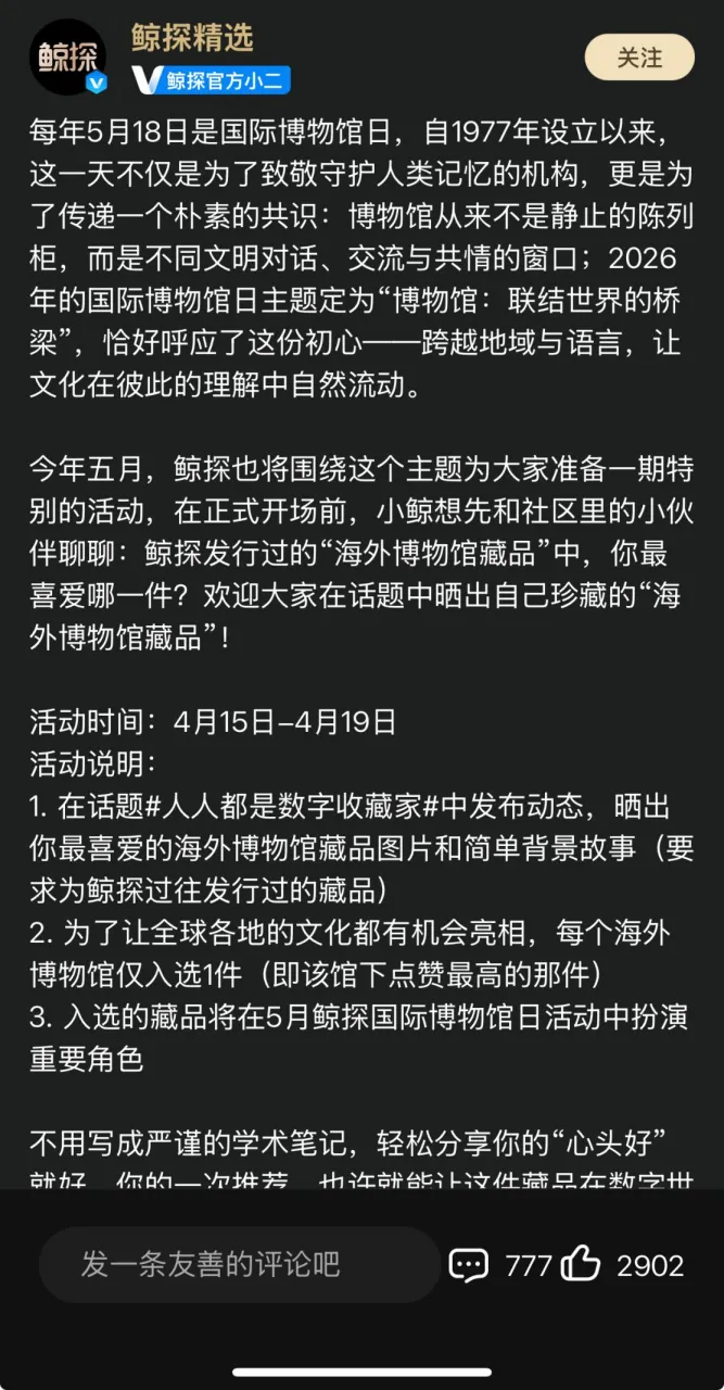 赌一把海外博物馆的原因,是看到了前几天鲸探的活动,偏偏今年518国际博物馆日的主题也点题了“博物馆:联结世界的桥梁”