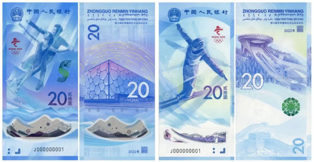 央行发行的首套对钞,一套两张,冰上运动为塑料钞,雪上运动为纸钞,特殊号码有一定的溢价。