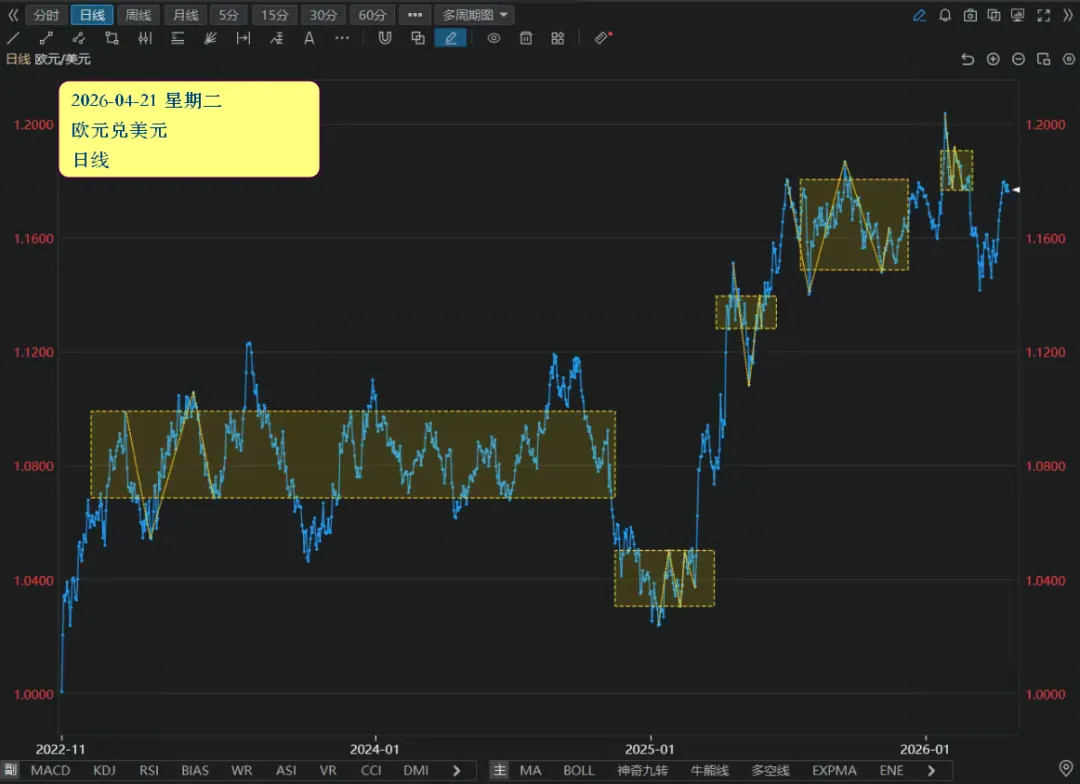 我是一个金融投资专家。先学习 rules/*.md 目录下面的文件,总结出我的策略规则。分析: k/20260421_eurusd/kd.png 是日线k线图告诉我目前最近的一个平台的位置和趋势方向,直接出结果。
