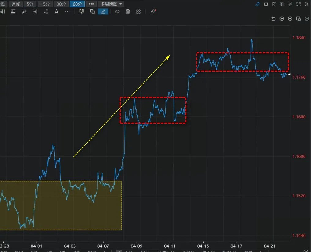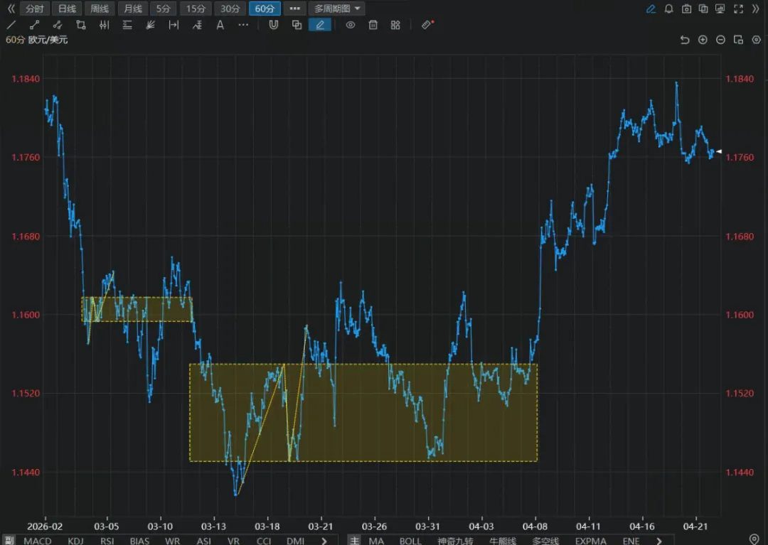 60分钟方向:上涨趋势中的回调阶段 ✅(从1.1440涨至1.1840,当前回调至1.1760)