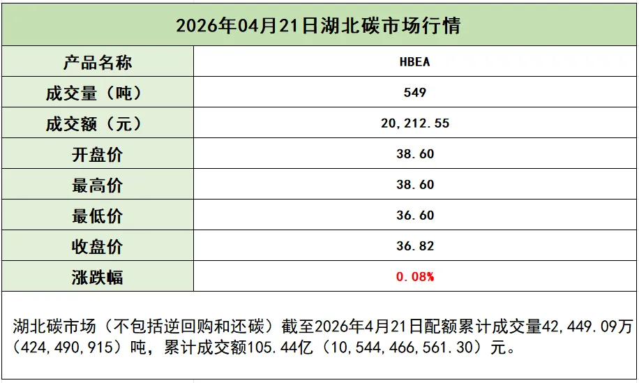 当前位置:首页>行情>【碳市场行情】2026年4月21日湖北及全国交易数据