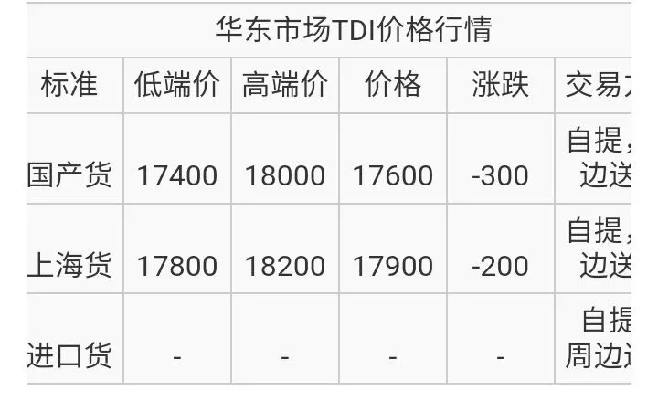 华东TDI国产货价格在17400-18000元/吨;上海货价格在17800-18200元/吨附近。