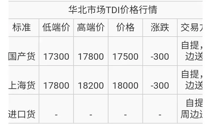 华北TDI国产货报盘价格在17300-17800元/吨,上海货报盘价格在17800-18200元/吨。