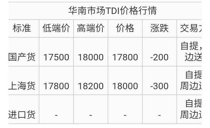 华南TDI国产货报盘价格在17500-18000元/吨,上海货报盘价格在17800-18200元/吨,存零星低价听闻。
