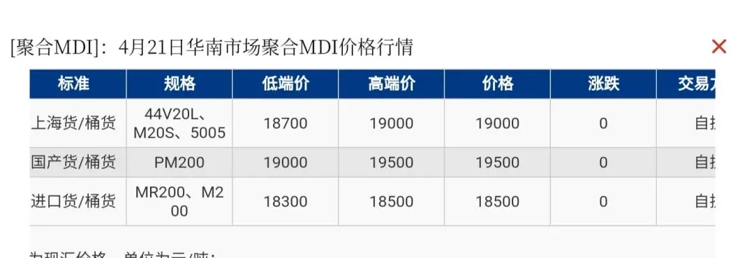 华南区域聚合MDI上海货报盘18700-19000元/吨,国产货(PM200)报盘19000-19500元/吨,进口货报盘18300-18500元/吨。