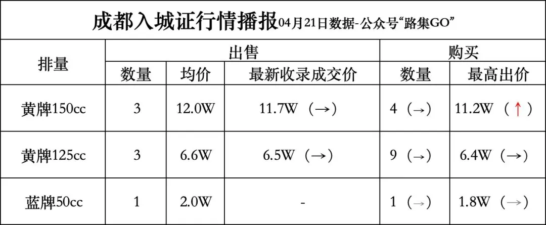 排量:蓝牌为两轮轻便摩托车/电动两轮轻便摩托车,黄牌为普通二轮摩托车/电动二轮摩托车。黄牌125cc为125cc入城证。黄牌150cc为150cc入城证。最新收录成交价:通过"路集GO"平台签约并成功交易的成交价格。相关符号注释:"↑"、"↓"、"→",分别为相对上个收录价格上涨、下跌、横盘趋势符号。"/",表示无上个收录价格。1. 展示最近一次交易金额,并经交易双方车友授权后,保全隐私安全基础上,以实际成交合约签订金额(若未签合约已实际转账为准)为数据标准。2.接受合法服务性质的纯挂牌(满足车友纯路权交易需求),由低到高向车友推荐。并经当事双方授权后,确保隐私安全基础上,以合约签订金额(若未签合约已实际转账为准),不含其他手续费,为数据标准。3.接受合理价格挂牌,平台仅展示求购最高价,出售均价/出售最低价。高于/低于最近成交价10%的价格将会被隐藏不展示。以上为平台每日参考报价信息采集规范,接受广大车友随时监督。为维护广大车友整体利益,促进交易市场稳定,拒绝市场囤牌炒作,恶意做空,信息欺诈等行为,广大车友如发现违法和不良信息的可通过拨打中央网信办(国家互联网信息办公室)举报中心电话12377或拨打12315工商市场监管部门等合法途径积极投诉举报维护自身合法权益。平台将同车友一道努力推进交易信息公开化。