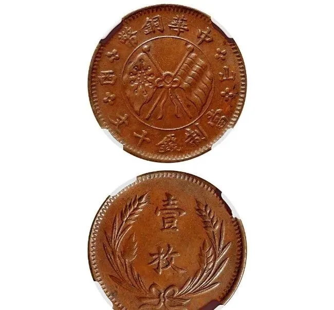 这个图上那枚亮堂堂的家伙,正面两面旗帜迎风飘,叫中华铜币左右“山西”双旗背嘉禾“壹枚”十文,一看就是民国年头山西本地铸的,旗子细节勾得到位,中间嵌一颗五角星,旁边边花一段一段的,背后压着嘉禾麦穗,*“壹枚”*两字盘在中间。