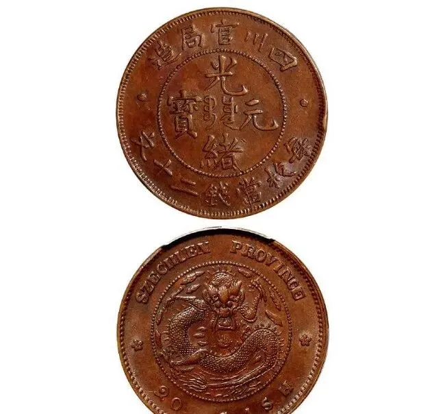 这张图上刻着大龙的,就是四川官局造光绪元宝二十文铜币,细看外缘“每枚当钱二十文”,珠圈里“光绪元宝”“宝川”满文工工整整,背面正中一条龙,靠近了还能瞧见龙须蜷曲着,铜质红里透光,没上锈没走色,一摸全是旧时包浆的厚道劲。