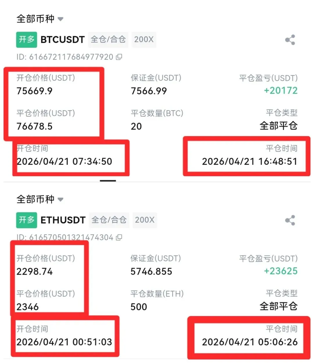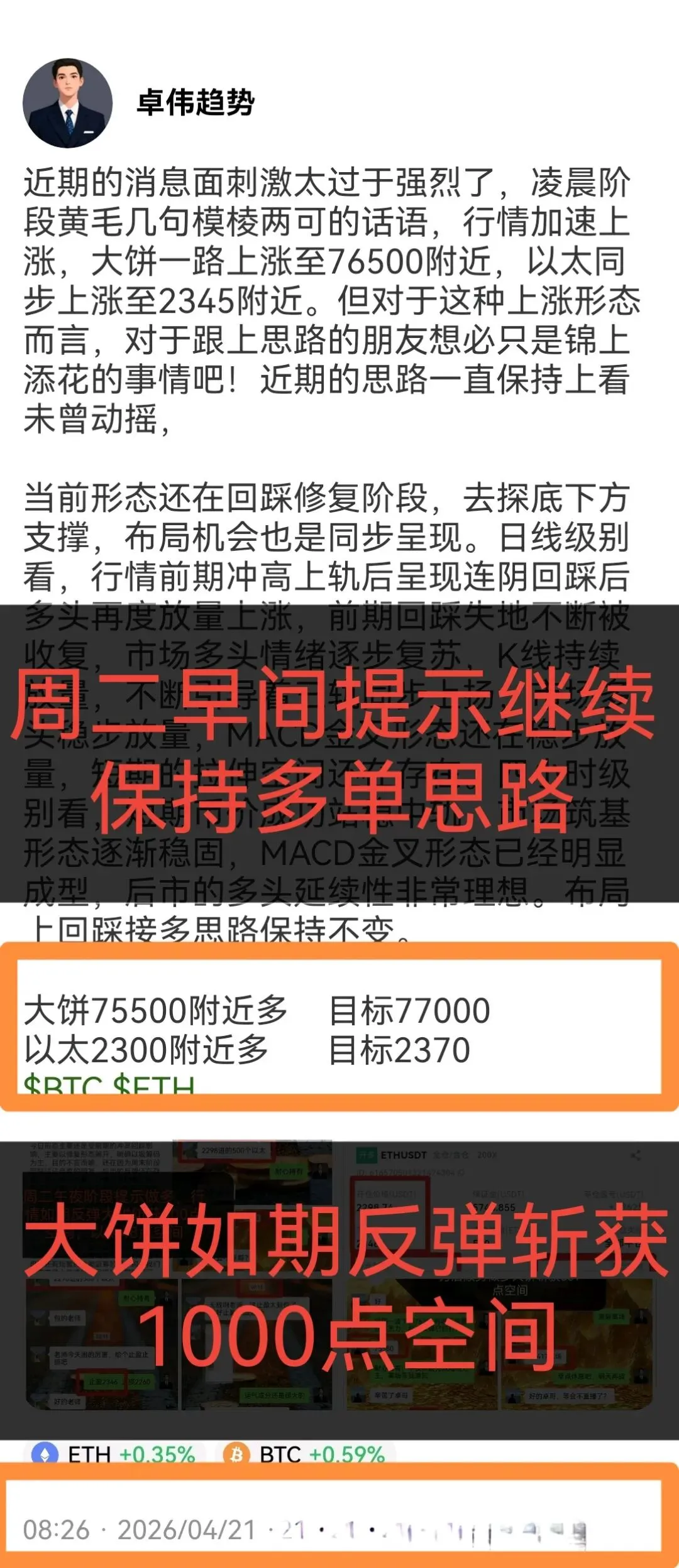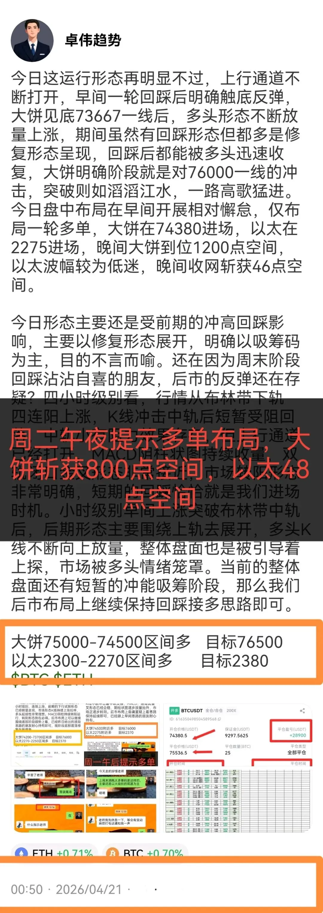 今日盘中布局以单边回踩接多展开,午夜阶段一轮多单布局大饼在75580进场,以太在2298进场。行情如期反弹上涨后大饼斩获800点空间,以太48点空间。