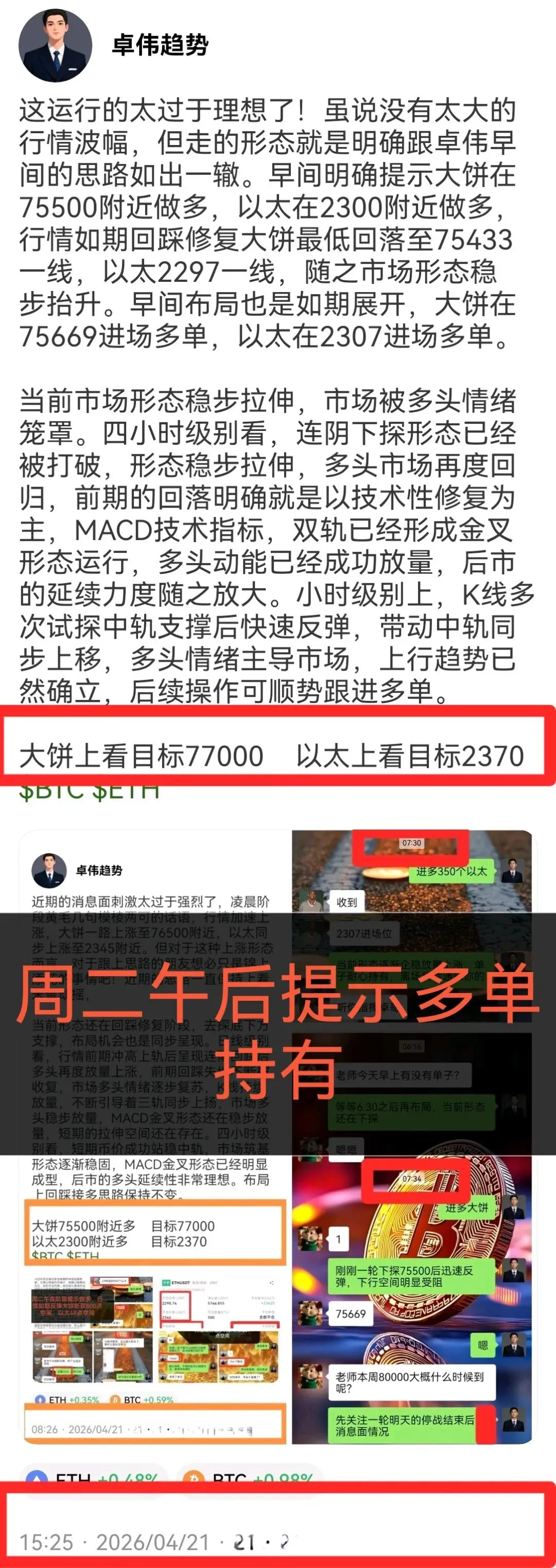 后市日内先扬后仰,白盘阶段一轮冲高大饼最高上涨至76999一线,早间布局大饼多单在75669进场,小获1000点空间到位!早间同步布局多单以太在2307进场,现阶段处于持有阶段。