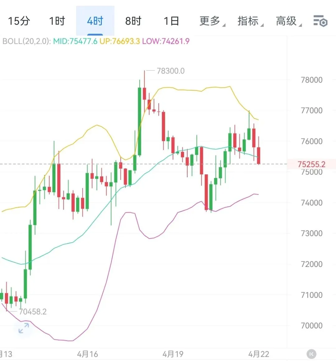 今日晚间这行情就有点索然无味了,世事无常。期待一整天的行情爆发并没有如期展开,到头来走的区间震荡。从午夜阶段开始行情一路飙升上涨,大饼从75000附近拉伸2000点至77000附近。以太相对较为低迷,仅上涨50余点空间,最高反弹至2346一线。