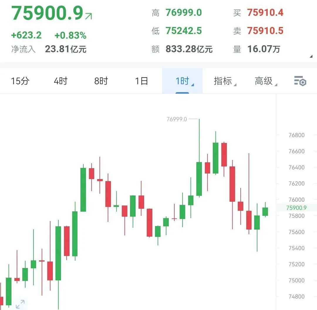 凌晨启动上攻,一路拉涨至日内高点76999,创出近期新高,多头情绪一度非常亢奋,但高点未能站稳,随后开启连续回落,红柱连续收跌,价格重心持续下移,从高点到收盘走出了明显的回调走势,多头动能出现衰竭迹象。今天实盘俩个看空,整体拿下俩千点位,同步布局也是拿下一百点空间,今天的大盘虽说整体下降点位并不是很多,在我精准把握的时机下,也是带领俩位朋友成功落袋离场。
