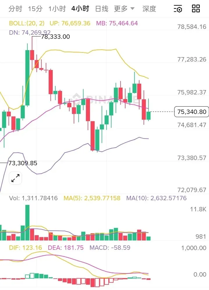 昨晚市场在冲高77000一线后受阻回落,最低下探至74800附近获得支撑,当前比价反弹至75400区域整理。从技术形态看,74800一带已形成短期有效支撑位,昨晚回踩确认未破,表明下方买盘承接意愿较强。同时4小时级别KDJ于超卖区域出现金叉信号,RSI也自低位拐头向上,显示短期空头动能逐步减弱,反弹修复需求增强。