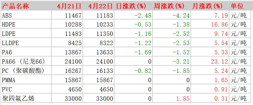 今日塑料报价(日、周、月涨跌)