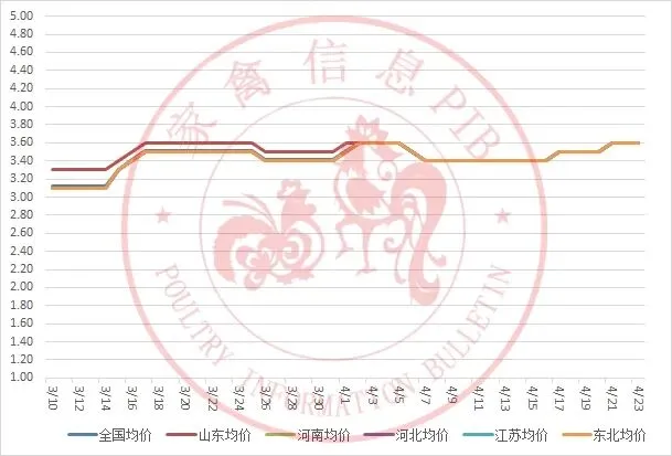 2026年3月10日-2026年4月23日主流地区白羽鸡鸡苗均价走势图