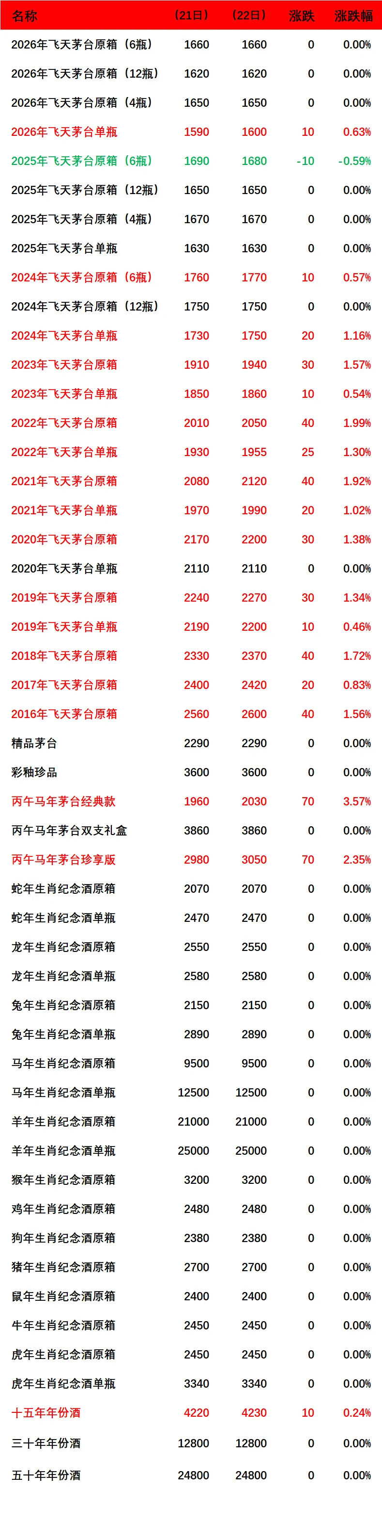 2016年、2017、2018飞天茅台原箱,2019年飞天茅台原箱和单瓶,2020年飞天茅台原箱,2021年飞天茅台原箱和单瓶,2022年飞天茅台原箱和单箱,2023年飞天茅台原箱和单箱,2024年飞天茅台原箱(6瓶)和单瓶,2026年飞天茅台单瓶,丙午马年珍享版,丙午马年经典版,十五年年份酒等多个产品价格大涨;