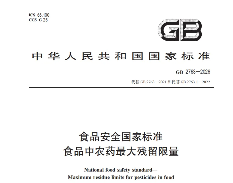 2026年3月1日,GB2763-2026《食品安全国家标准 食品中农药最大残留限量》正式实施;