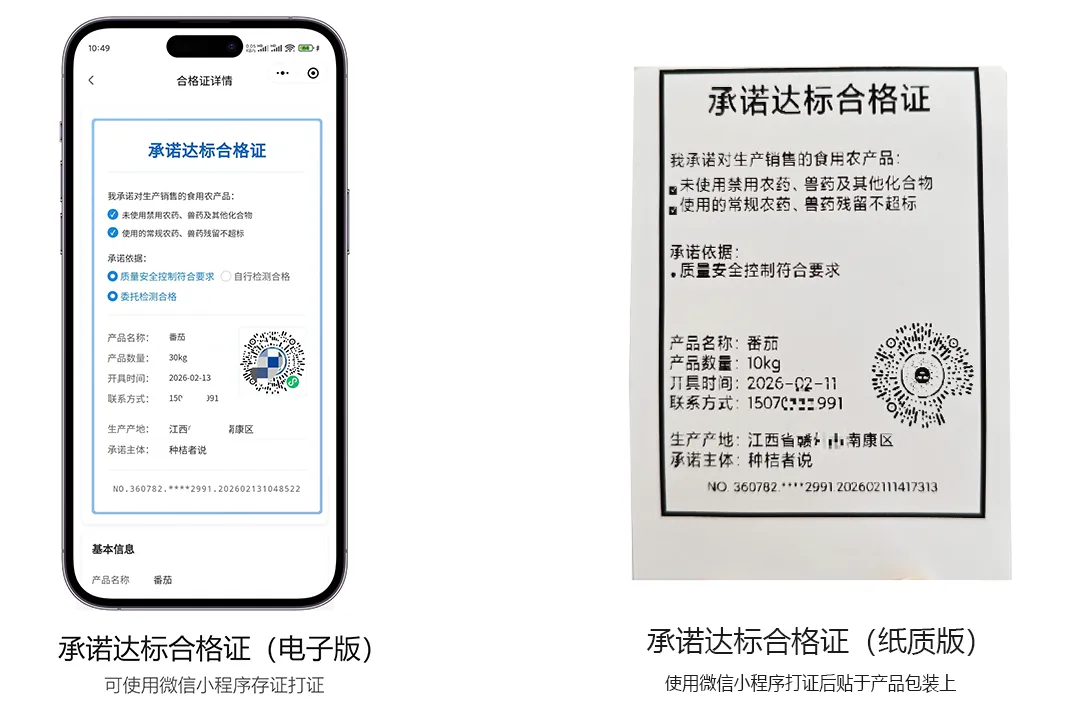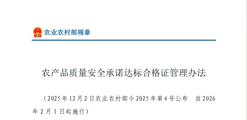 2026年2月1日,《农产品质量安全承诺达标合格证管理办法》正式实施;