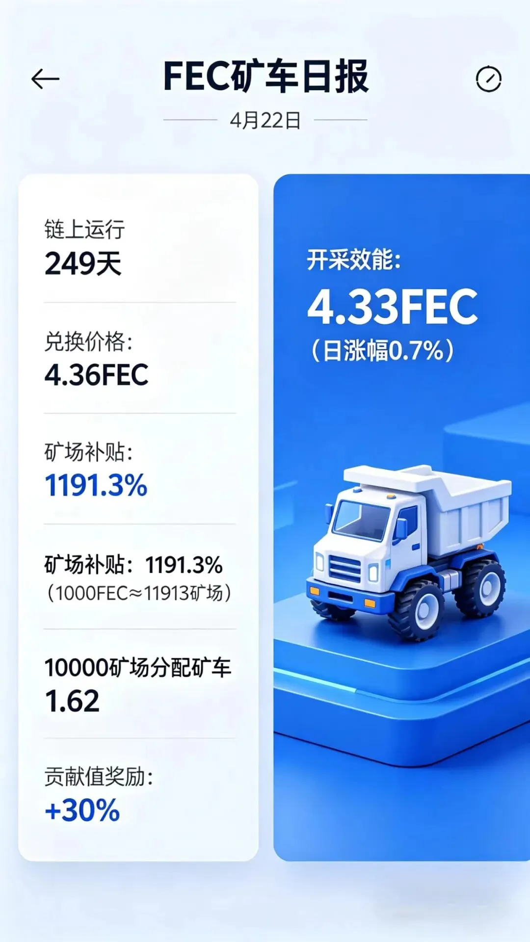 各位家人,早上好☀️4月22号 FEC矿车每日行情日报 链上持续稳定运行,已经稳稳跑了249天,全程稳健不掉线👍 重点来看咱们核心的开采效能今天开采效能做到 4.33 FEC单日涨幅0.7%,稳步小涨,持续回血增产~ 兑换现价:4.36 FEC矿场补贴超高给到 1191.3%换算一下:1000FEC 约等于 11913 矿场 一万矿场每天可分配矿车1.62台再加30%贡献值额外奖励福利拉满,收益叠加,整体行情平稳向好……