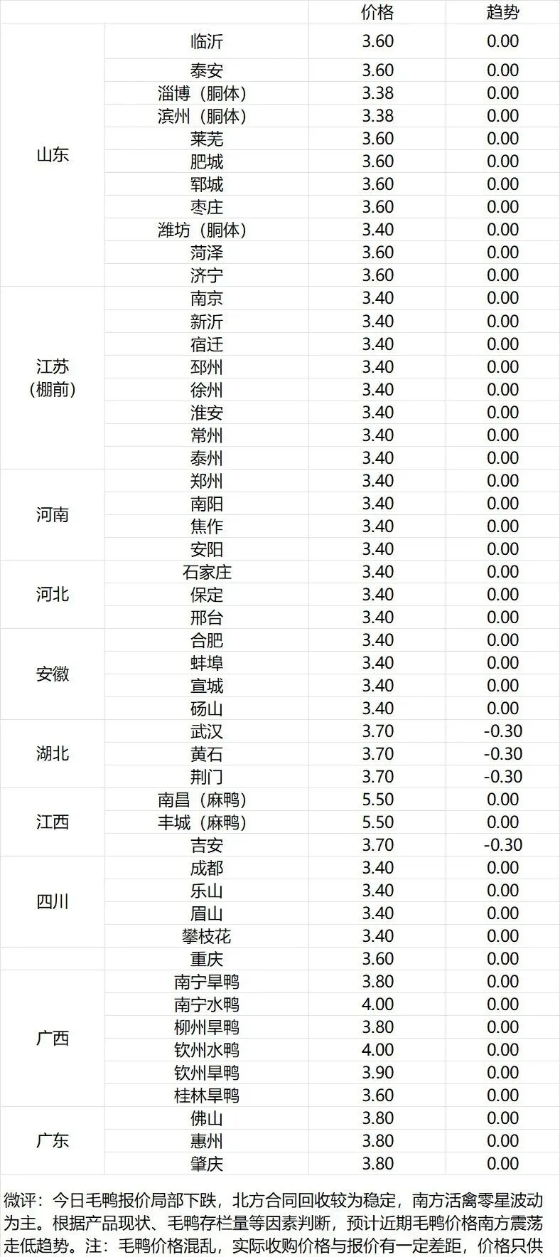 微评:鸭苗报价下跌。(注:南方只报当天价格)大厂控量保价,养殖端补栏情绪略有降温。根据产品、养殖成本及鸭苗现状分析,预计近期鸭苗价格呈震荡微调趋势。种蛋报价落5分。温馨提示:该价格为主流厂家报价,实际销售价格以成交价格为准,价格仅供参考。