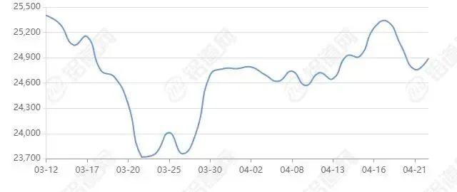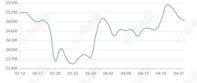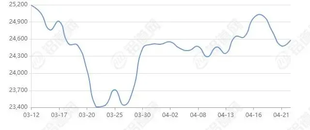 2026年04月22日上海期货行情价24940涨跌+30,最低24810,最高24965,前三日均价25273,前五日均价25084。