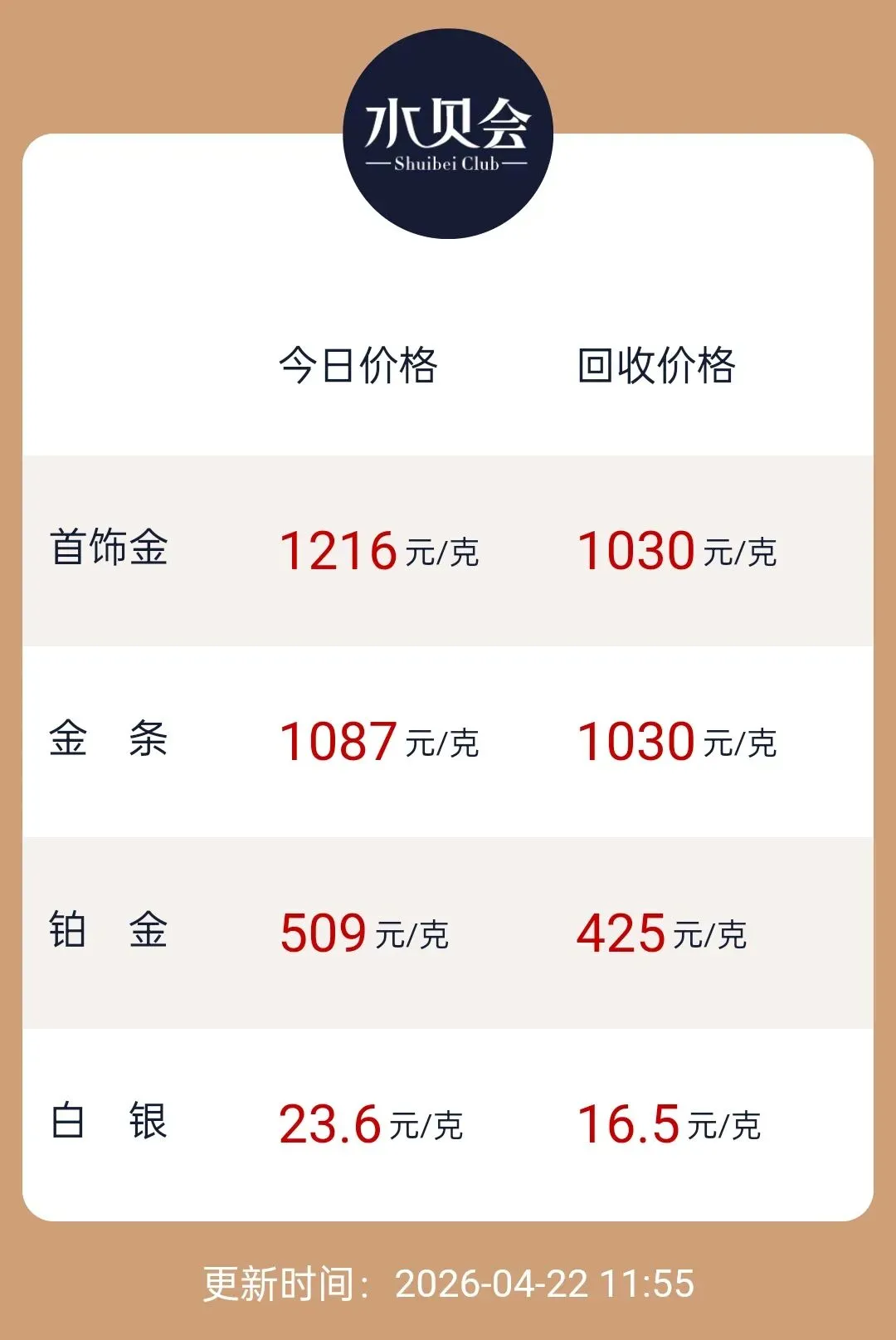水贝首饰金参考价即为深圳水贝零售金首饰价,由于黄金税发布,市场目前销售首饰金金价普遍是大盘价(融通金价)上浮加80-120元/克不等,主流批发商报价为:1140-1150元/克。