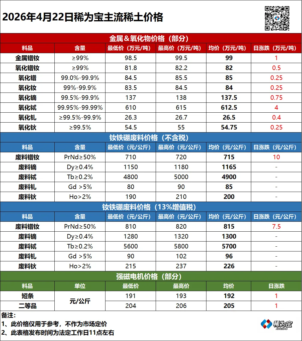 >【稀土行情】2026年4月22日稀土价格汇总(仅供参考)
