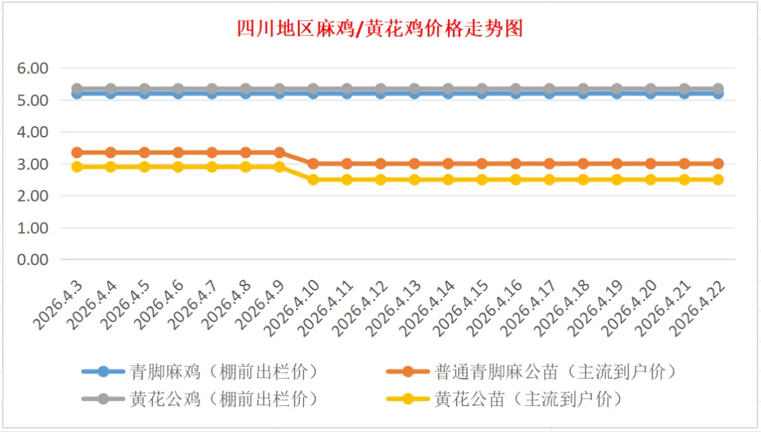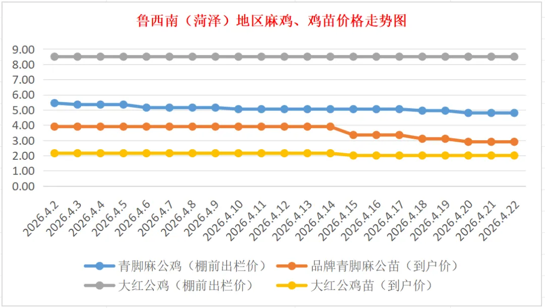 品牌青脚麻公苗(多品种快大型):价格稳定,到户价4.20元/羽,稳。