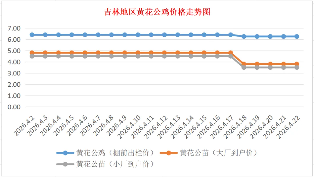 黄花公苗:价格稳定,大厂到户价3.80元/羽,小厂到户价3.50元/羽,稳。