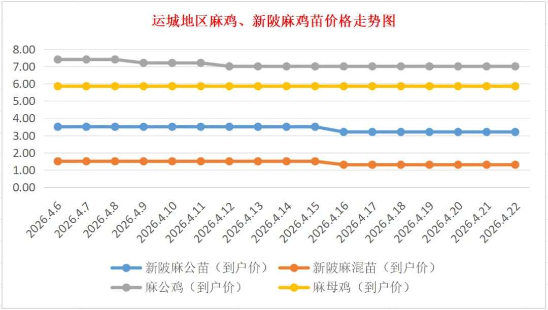 普通新陂麻:价格稳定,到户价公苗4.00元/羽,稳。