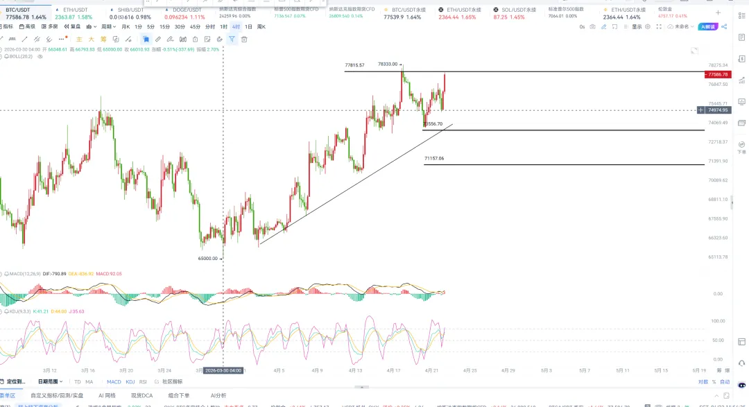 3、短线思路:先去77500-77700附近空单位置73800-72000附近,风控100点,只要得到73000破位空单持有。先看71000可以平掉三分之一的空单先把利润拿到手,后续的空单建议不用管,就算面临部分反弹也是有利润在手的。