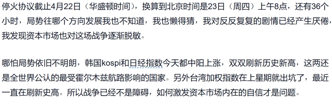 今天伊朗那边的形势不算乐观,万斯率领的美国谈判团已经到了伊斯兰堡,但是伊朗的代表团截止我写作这会还没有出发,理由是美军昨天袭击和扣押了试图闯关的商船(图斯卡号),伊朗认为美军的封锁是武力胁迫,他们拒绝在被武力胁迫的情况下参加谈判。
