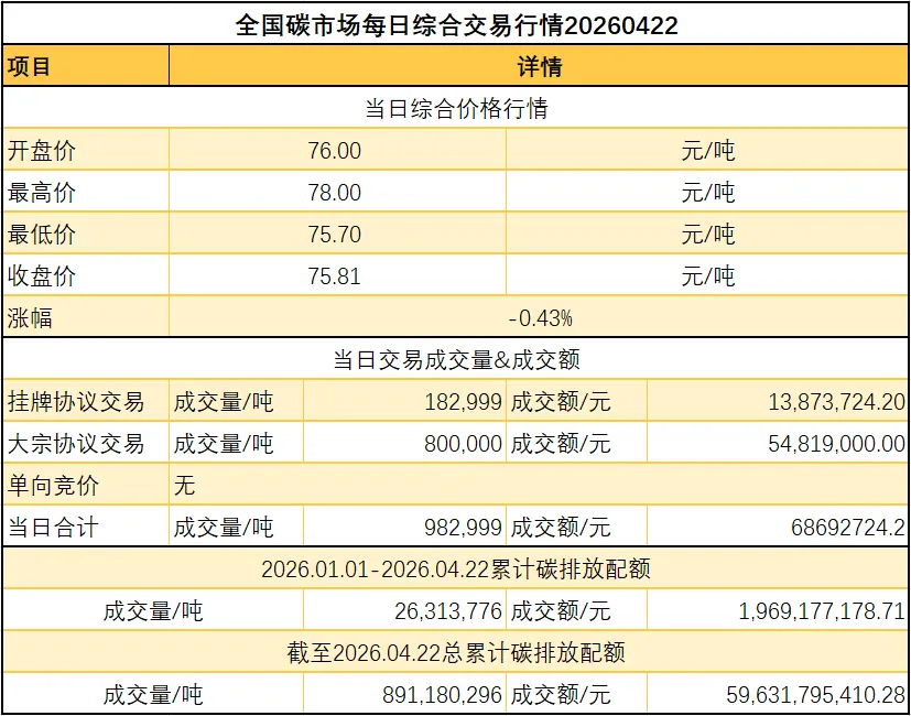>【CEA】全国碳市场每日综合价格行情及成交信息20260422
