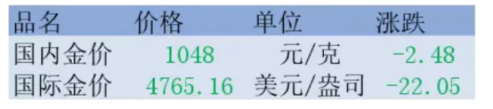 今日黄金市场延续回调走势,内外盘价格同步下行。国内现货黄金报价1048 元 / 克,日内下跌 2.48 元 / 克;国际伦敦金现报4765.16 美元 / 盎司,日内下跌 22.05 美元 / 盎司,价格重心持续下移。